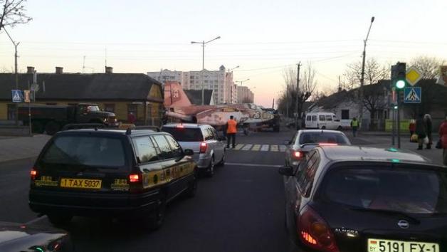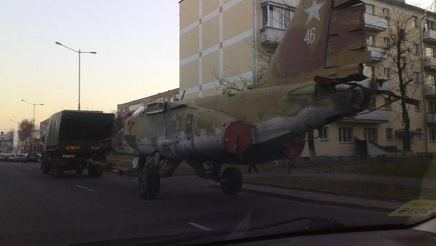 Штурмавікі Су-25 везлі на авіязавод праз горад. Чытач даслаў у рэдакцыю "ІР" фотаздымкі, дзе бачна, як па вуліцах горада вязуць два штурмавікі Су-25.