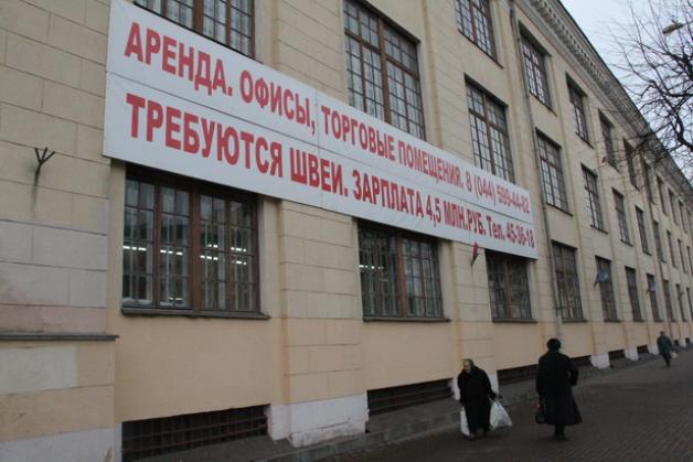 Объявление на фасаде Барановичской швейной фабрики. Швеи утверждают, что получить 4,5 млн рублей практически нереально, однако руководство предприятия уверено: квалифицированная швея может заработать и больше. Фото: Александр ТРИПУТЬКО
