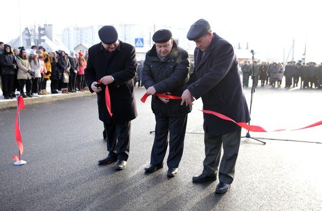 Символическую ленточку на открытии улицы перерезали председатель Барановичского горисполкома Юрий Громаковский, директор УКРСП Барановичиремстрой Владимир Кудласевич и директор ДСУ №22 Александр Кухарчик. Фото: Дмитрий МАКАРЕВИЧ