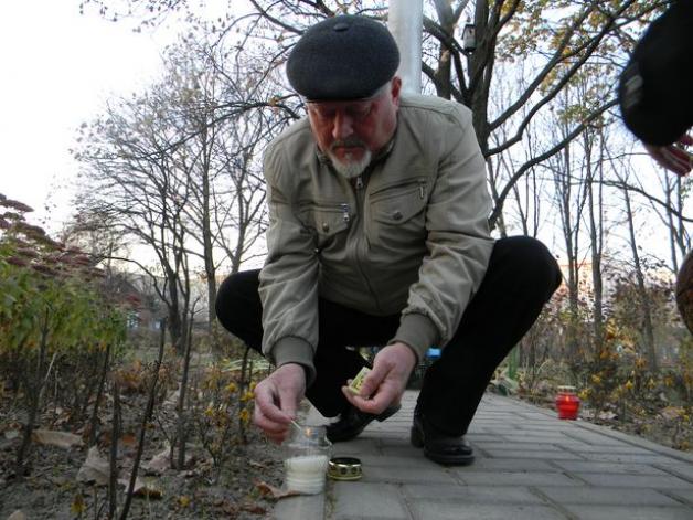 Сяргей Гоўша падпальвае на Дзяды знічку каля крыжа Ахвярам сталінскіх рэпрэсій. Фота: архіў Сяргея ГОЎШЫ