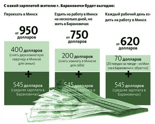Житель г. Барановичи Александр Фролов на личном опыте убедился в том, что заработать в Минске можно больше, чем в Барановичах. Мужчина устроился работать водителем в одну из столичных фирм в среднем за 700 долларов в месяц на автомобиле работодателя, несколько раз в месяц ездит в Минск на склад, а остальное время работает по Барановичам.