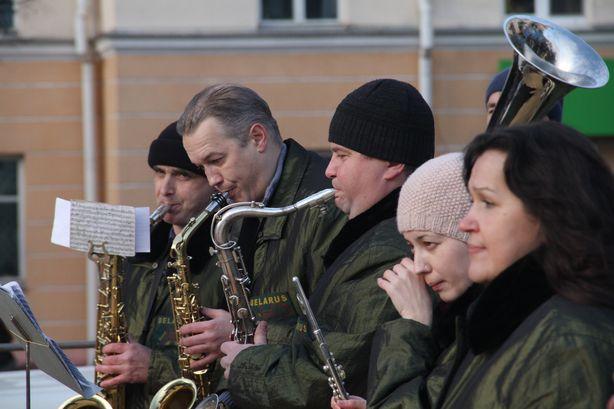 С субботу, 13 декабря, на городской площади Барановичей Дед Мороз и Снегурочка зажгли огни на новогодней елке. Горожане увидели театрализованное представление и смогли купить новогодние подарки. Самое удобное место для просмотра представления. Фото: Александр ТРИПУТЬКО. Оркестр под управлением магистра музыки Василия Прадуна. Фото: Александр ТРИПУТЬКО. Фрагмент представления. Фото: Александр ТРИПУТЬКО.