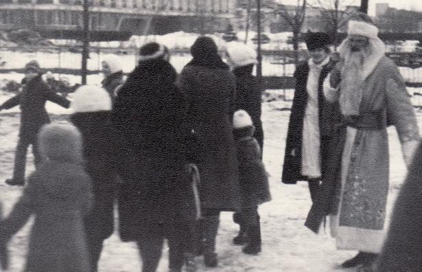 Мне кажется, он был лучшим Дедом Морозом в городе. Правда, я не раз советовала ему поправиться – немного тощим он был для своего персонажа. Чтобы хоть как-то «потолстеть», под костюм он всегда надевал шубу. В зале народа много, а он в двух шубах. Да еще и в валенках. После представления мы просушивали его наряд и снова торопились на следующий утренник. Однажды мой Дед Мороз так бежал к детям, что поскользнулся на паркете и упал. Представьте, в валенках и в своем двойном костюме. Я думала, нас засмеют. Ан нет, наоборот. Всем понравился этот «трюк», все детишки бросились спасать дедушку, а родители посчитали, что все идет по сценарию. В сценарии мы это и оставили. Новогодний хоровод около Дворца культуры «Текстильщик», 1976 год.