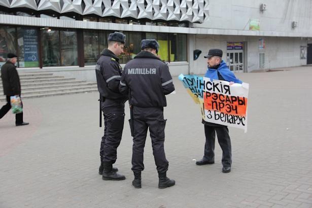 События, разворачивающиеся в соседней стране, разделили белорусское общество на два противоборствующих лагеря: тех, кто сопереживает «сепаратистам», и тех, кто поддерживает украинские власти. Барановичский активист Владимир Гундарь, желая поддержать украинский народ, вышел на центральную площадь города с украинским флагом на плечах и плакатом в руках. Демарш горожанина не остался незамеченным – его забрали в милицию и по решению суда оштрафовали за «нарушение порядка организации или проведения массовых мероприятий» почти на 2 млн рублей. Активист Владимир Гундарь провел одиночный пикет солидарности с украинским народом, 4 марта 2014 года. Незаметность года