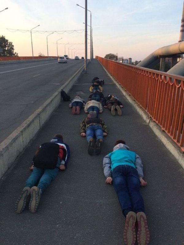 Барановичские школьники даже представить не могли, какой резонанс вызовет их желание удивить окружающих необычным поступком. Планкинг барановичских школьников на мосту. Фотографии, выложенные в соцсети, принесли подросткам не только славу, но и проблемы. Подростки организовали так называемый «планкинг» – они ложились лицом вниз, вытянув руки, в самых непредсказуемых местах: на тротуаре, пешеходном переходе, на ступеньках горисполкома и кинотеатра «Октябрь». Дети выложили фото в соцсети, и вместе со «славой» получили проблемы в школе и нелицеприятный разговор с милицией. Сначала в флэшмобе увидели политический подтекст, позже участников планкинга обвинили в нарушении правил дорожного движения. По информации пресс-службы Барановичского ГОВД, было составлено три административных протокола.