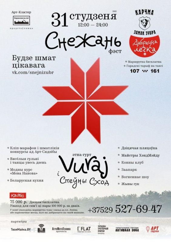 Гости фестиваля смогут услышать выступление группы Vuraj, посмотреть клип-марафон от «Арт-Сядзібы», попеть в белорусском караоке, пострелять из арбалета и лука, а также насладиться живой музыкой, которая будет звучать в течение всего дня. – Мы решили провести этот фестиваль для того, чтобы популяризировать белорусскую культуру среди молодежи. Хотя «Снежань» будет интересен людям всех возрастов, – говорит один из организаторов фестиваля Андрей Тяпин. По его словам, для детей здесь будет работать фотограф, а также анимация от проекта городской библиотеки «Детская площадка». Молодежь сможет попеть в белорусском караоке, где зазвучат песни таких групп, как «Крамбамбуля», «Стары Ольса» и «NRM», а также посмотреть клип-марафон белорусскоязычных групп. Людям постарше будут интересны коллективы «Лирники» и «Кросны», а также выставка-ярмарка Hand Made от двух десятков мастеров из разных городов Беларуси. Гости смогут посмотреть представления рыцарского клуба «Шляхецкая застава» и фаер-клуба Waidelott, пострелять из лука благодаря Лиге вольных стрелков, а также отведать блюда белорусской кухни. Хэдлайнером же фестиваля станет группа Vuraj, сочетающая в своем творчестве народную музыку с современной. – Пока мы задумывали «Снежань», оказалось, что уже «Студзень». Мы немного расстроились, а потом решили что... Ну «Снежань» и «Снежань»! Приглашаем всех жителей города Барановичи и района на большой зимний праздник, – объясняют выбор названия фестиваля организаторы. «Снежань» состоится в субботу, 31 января, в корчме «Замок Зубра» с 12.00 до 24.00. – Добраться до места проведения можно тремя способами: специальными маршрутками, стоимость которых входит в цену билета, на такси по специальному тарифу и на собственном авто, – рассказал Андрей Тяпин. По словам собеседника, такси 161 будет заниматься доставкой из любой точки по городскому тарифу: 20000 посадочные и 4500 руб./км. Кроме того, с 11.30 до 16.00 с получасовым интервалом будет курсировать маршрутка "пл. Ленина (со стороны горисполкома) – Корчма «Замок Зубра» и обратно. С 16.00 до 00.00 маршрутка будет отправляться по мере заполняемости. Подробности на странице группы «ВКонтакте».