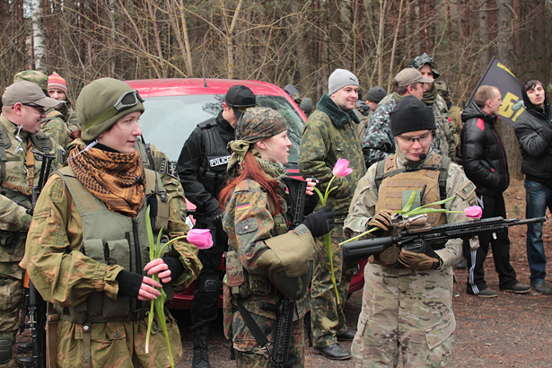Кроме мужчин, в страйкбол также играли и девушки. На построении перед игрой их поздравили организаторы игры – Барановичское страйкбольное сообщество – с прошедшим 8 Марта и подарили страйкболисткам тюльпаны.