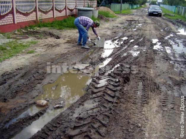 Местные жители пытаются улучшить состояние дороги, засыпая грязь и лужи строительным мусором, но проехать по улице Скрябина все равно проблематично, 2010 год. Фото: Зина ДРОЗД, архив Intex-press