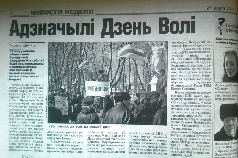 2003 год. Напярэдадні, 22 сакавіка, КХП БНФ правялі мітынг, прысвечаны Дню Волі ў парку імя 30 год УЛКСМ. А 25 сакавіка ў вялікай зале ДКТ адбылася імпрэза «Беларусь – наша слаўная Радзіма», у якой прынялі ўдзел усе дэмакратычныя партыі і грамадскія аб’яднанні таго часу. Пасля дакладаў прайшоў канцэрт, у якім удзельнічалі творчыя калектывы горада, музычнай вучэльні, педагагічнага каледжа, СШ №17. Студэнты Баранавіцкага філіяла інстытута кіравання паставілі фрагмент спектакля «Паўлінка».