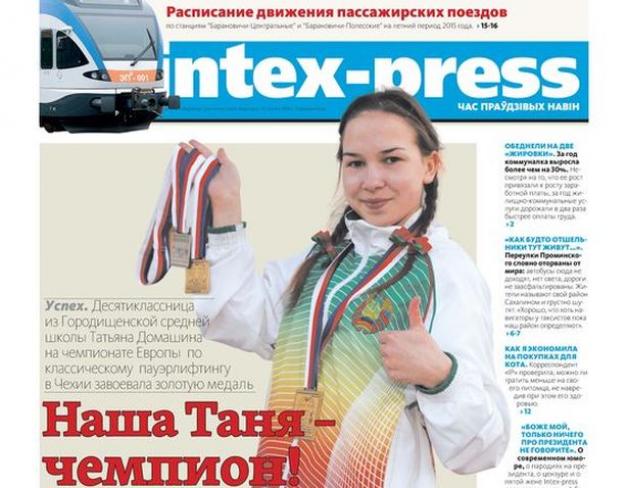 Десятиклассница из Городищенской средней школы Татьяна Домашина на чемпионате Европы по классическому пауэрлифтингу в Чехии завоевала золотую медаль. Читайте также в новом номере газеты: – Расписание движения пассажирских поездов по станциям "Барановичи-Полесские" и "Барановичи-Центральные" на летний период (вводится с 29 марта 2015 года). – За год коммуналка выросла более чем на 30%. Несмотря на то, что ее рост привязали к росту заработной платы, за год жилищно-коммунальные услуги дорожали в два раза быстрее оплаты труда. Обеднели на две «жировки». – Переулки Проминского словно оторвали от мира: автобусы сюда не ходят, света нет, дороги не заасфальтированы. Жители называют свой район Сахалином и грустно шутят: «Хорошо, что хоть навигаторы у таксистов пока наш район определяют». – Каковы причины возникновения анорексии, кто в группе риска и как часто случаи этого «модного» заболевания регистрируются в Барановичах? Худое дело, или Красота на грани болезни. – Корреспондет Intex-press проверила, можно ли тратить меньше средств на своего питомца, не принося вреда его здоровью. Как я экономила на покупках для кота. – О современном юморе, о пародиях на президента, цензуре и о пятой жене рассказал известный белорусский юморист Евгений Крыжановский. – Несмотря на плохое финансирование, строители обещают сдать дамбу на водохранилище Мышанка в срок. К купальному сезону планируется его заполнить.