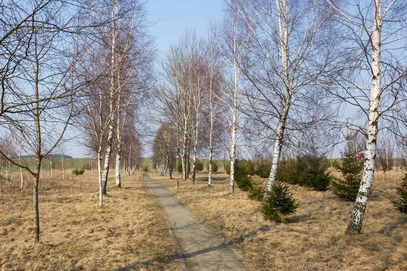 За постройками начинается березовая аллея, которая ведет к пруду.