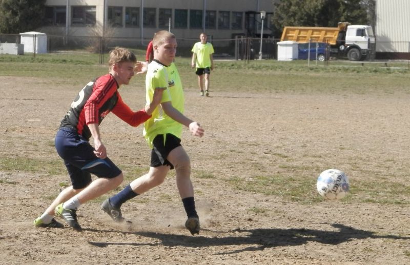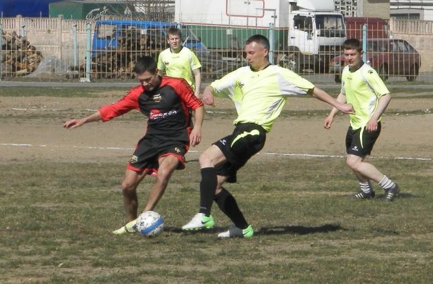 Футболист «Штурма» Иван Кот (в салатовом) против Кирилла Николаенко из «Восхода». Фото Сергея ЖИВУЛЫ