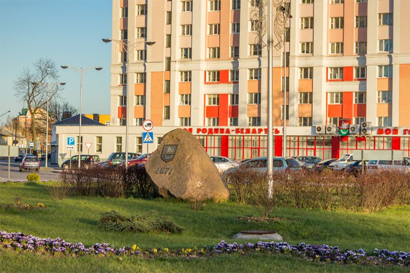 Камень с гербом и годом основания города на кольцевой развязке улицы Советской. Фото: Юрий ПИВОВАРЧИК