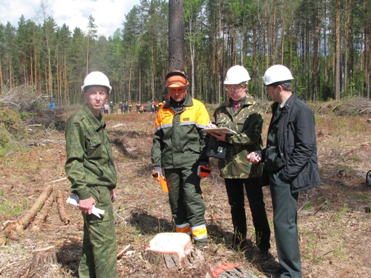 На адведзенай дзялянцы ў Люсінскім лясніцтве шляхам жараб’ёўкі кожнаму вальшчыку “дасталася” гонкая векавая сасна. На працягу дзесяці мінут неабходна было вызначыць накірунак, у які будзе падаць дрэва, спілаваць яго такім чынам, каб ствол лёг дакладна ва ўказаную кропку. Улічвалася літаральна ўсё: адхіленне дрэва ад зададзенага накірунку падзення, глыбіня і вугал падпілу, пашкоджанне ствала і г. д. Нягледзячы на парывы ветру, большасць удзельнікаў паспяхова справіліся з гэтым даволі нялёгкім заданнем.
