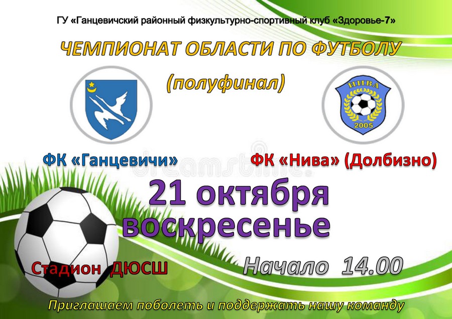 21 октября (воскресенье) ГУ «Ганцевичский районный физкультурно-спортивный клуб «Здоровье-7» приглашает жителей и гостей Ганцевщины на матч чемпионата области по футболу (полуфинал) между ФК «Ганцевичи» и ФК «Нива» (Долбизно).