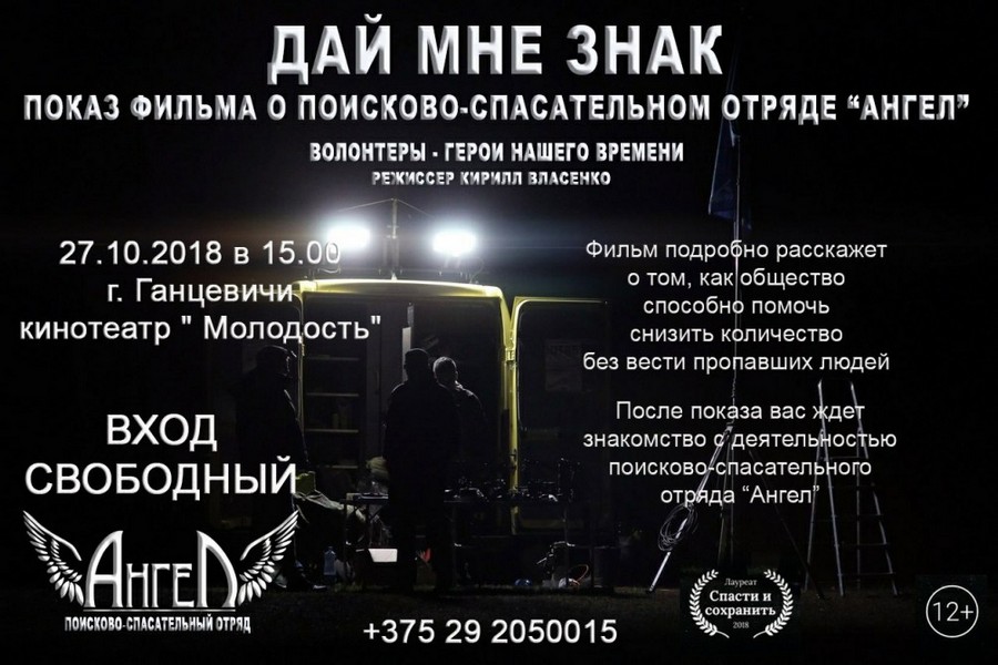27 октября кинотеатр «Маладосць» и поисково-спасательный отряд «Ангел» приглашают на показ документального фильма «Дай мне знак», который рассказывает о деятельности отряда и основан на реальных событиях. Участники отряда «Ангел» также познакомят со своей работой и техникой, которая используется при поиске пропавших людей.