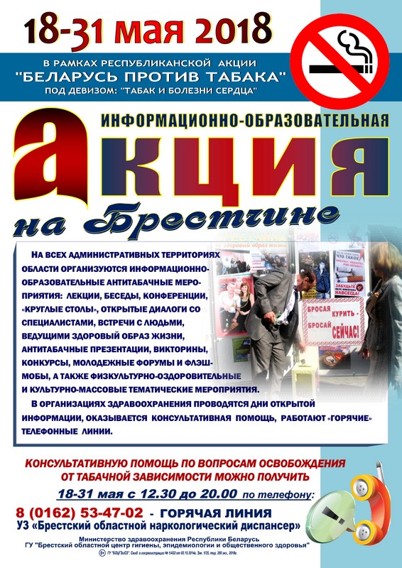 С 18 по 31 мая 2018 года в Республике Беларусь проводится информационно-образовательная акция «Беларусь против табака»