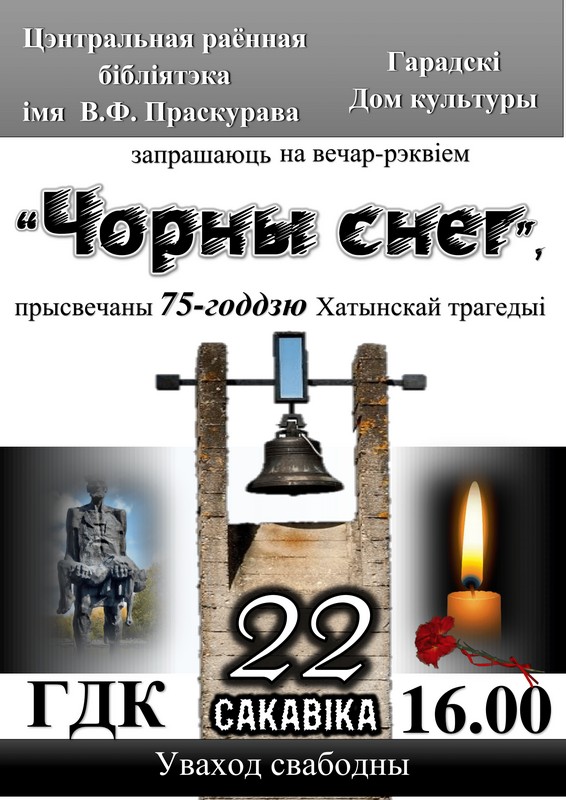 Приглашаем Вас на вечер-реквием, посвященный 75-летию Хатынской трагедии. Мероприятие состоится 22 марта в 16.00 в городском Доме культуры