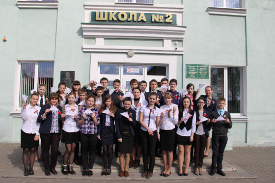 7 апреля девятиклассники ГУО «СШ № 2» стали участниками всебелорусской патриотической акции «Письмо победителю», приуроченной к 70-й годовщине Победы советского народа в Великой Отечественной войне. Организатором районного этапа стала первый секретарь районного комитета общественного объединения «Белорусский республиканский союз молодёжи» Людмила Чирун.