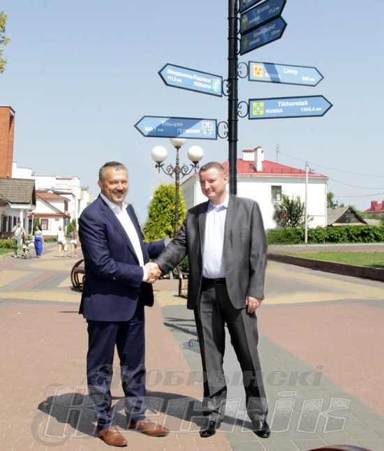 Менавіта гэтая думка і стала квінтэсенцыяй дзелавой сустрэчы ў Кобрыне паміж старшынёй Кобрынскага райвыканкама Аляксандрам Зазуляй і бургамістрам г. Бельск Падляскі (Польшча) Яраславам Бароўскім. Мерапрыемства адбылося на мінулым тыдні ў межах сёлетняга дагавора аб супрацоўніцтве паміж польскім і беларускім бакамі. Як адзначыў Аляксандр Зазуля, Кобрын і Бельск Падляскі маюць шматгадовую гісторыю добрасуседскіх адносін, якія тычыліся культурнага абмену і сумеснай работы ў сферы маладзёжнай палітыкі. Цяперашняе партнёрства замацавана юрыдычна і дазваляе рэалізаваць у перспектыве і такі важны праект, як шматграннае эканамічнае ўзаемадзеянне. Аляксандр Іванавіч выказаў думку наконт правядзення ў будучыні сумеснага міжнароднага бізнес-форуму для прадпрымальніцкіх эліт двух гарадоў, што, несумненна, будзе якасна новым імпульсам у развіцці двухбаковых стасункаў. У сваю чаргу, польскі госць з цікавасцю ўспрыняў такую прапанову і адзначыў, што Кобрын і Бельск Падляскі таксама ў межах трансгранічнага супрацоўніцтва пры фінансавай падтрымцы Еўрасаюза маюць магчымасць сумесна рэалізаваць шэраг цікавых праектаў. Яраслаў Бароўскі азнаёміўся з вытворчай базай прамысловых флагманаў нашага горада – ААТ “Кобрынскі масларобна-сыраробны завод” і СТАА “ВП Палессе”, а таксама з турыстычным патэнцыялам горада. Увазе польскага госця былі прадстаўлены парк імя А.В. Суворава, аквапарк, пешаходная вуліца Суворова, дзе, як вядома, не так даўно быў устаноўлены сімвал гарадоў-пабрацімаў. Дарэчы, Яраслаў Бароўскі ў Кобрыне ўпершыню. Беларусь наведваў чвэрць стагоддзя таму. Наш горад вельмі спадабаўся сваімі традыцыямі, чысцінёй, багатай гісторыка-культурнай спадчынай, а таксама спрыяльным інвестыцыйным кліматам, які прыцягвае не толькі развітой мясцовай інфраструктурай, але і геаграфіяй (адлегласць паміж двума гарадамі ўсяго 130 кіламетраў – Р.М.) Як падкрэсліў пан Бароўскі, кабрынчане і жыхары Бельска Падляскага вельмі падобныя ментальна. Шчырасць, добразычлівасць, жаданне сябраваць – менавіта тыя агульначалавечыя якасці, якія надзейна яднаюць палякаў і беларусаў. Раман МЕЛЬНІК. НА ЗДЫМКУ: Аляксандр Зазуля і Яраслаў Бароўскі каля сімвала гарадоў-пабрацімаў. Фота аўтара.