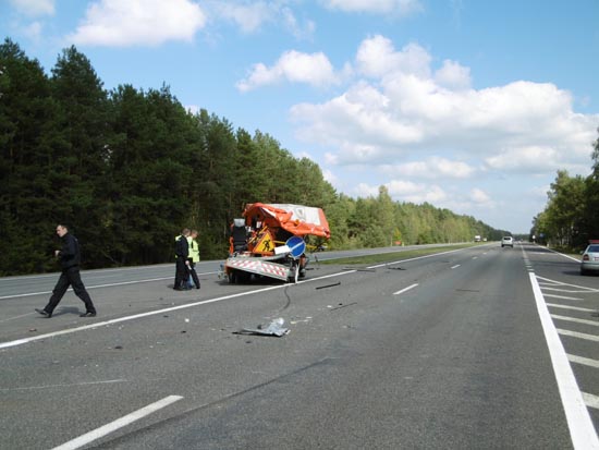 22. 09.2015 года примерно в 11.20 часов, водитель автомобиля «TOYOTA MATRIX», двигаясь по крайней правой полосе дороги М-1/Е30 (Брест-Минск) со стороны г. Кобрина в направлении г. Минска, на 87 км., при выполнении опережения двигавшегося впереди в попутном направлении грузового автомобиля, выехал на крайнюю левую полосу движения не убедившись, что данная полоса свободна и допустил столкновение с двигавшимся в попутном направлении по крайней левой полосе дороги и выполняющего дорожные работы по нанесению дорожной разметке автомобилем «GAZ 3302-11A»,обозначенного дорожными знаками и маячками оранжевого цвета в соответствии с ППД, после чего в правый придорожный кювет, где совершил наезд на придорожное дерево. В результате ДТП оба транспортных средства получили механические повреждения, водитель и пассажиры автомобиля «TOYOTA MATRIX» получили телесные повреждения и были доставлены на излечение в реанимационное отделение УЗ «Кобринская ЦРБ».