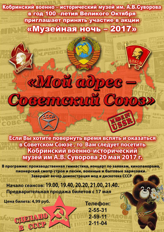 УК «Кобринский военно-исторический музей им. А. В. Суворова» в год 100-летия Великого октября приглашает 20 мая принять участие в акции «Музейная ночь-2017».
