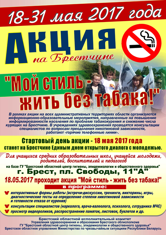 В 2017 году с 18 по 31 мая на брестчине проводится информационно-образовательная акция «Мой стиль жизни — без табака!»