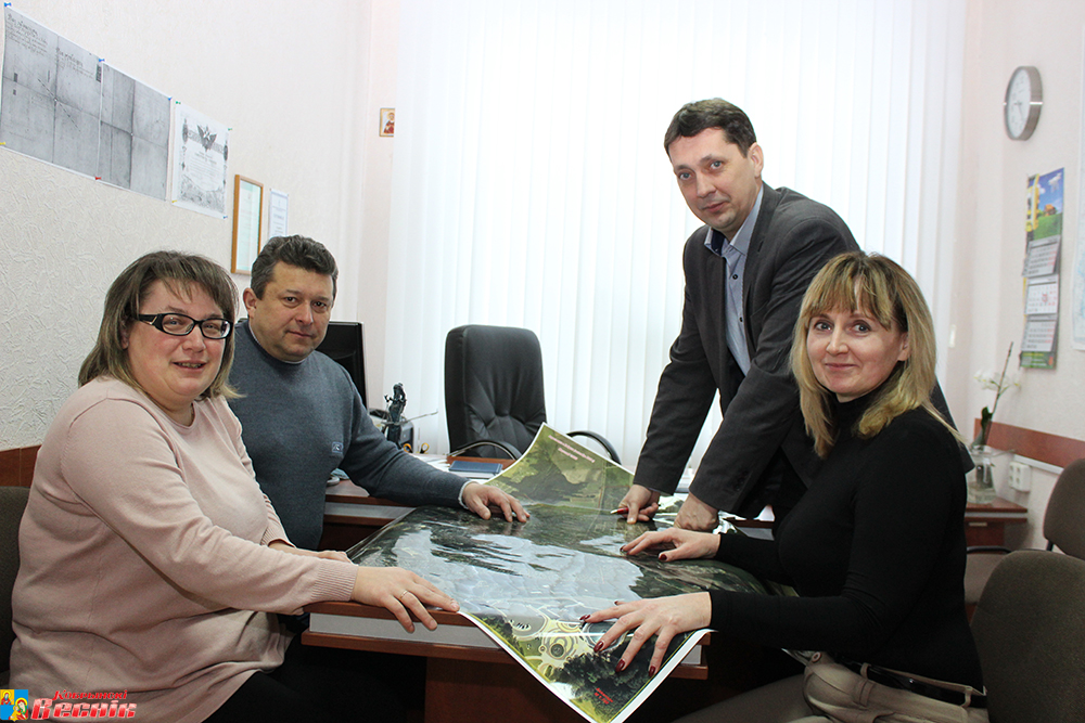НА СНИМКЕ автора: сотрудники землеустроительной службы Кобринского района за обсуждением аэрофотоснимка г. Кобрина.