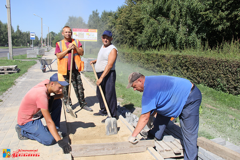 На снимке автора: укладку тротуарной плитки осуществляют рабочие дорожно—эксплуатационного участка КУМПП ЖКХ “Кобринское ЖКХ” Александр Страпко, Виталий Хилькович, Сергей Семихат и Павел Данильчик.