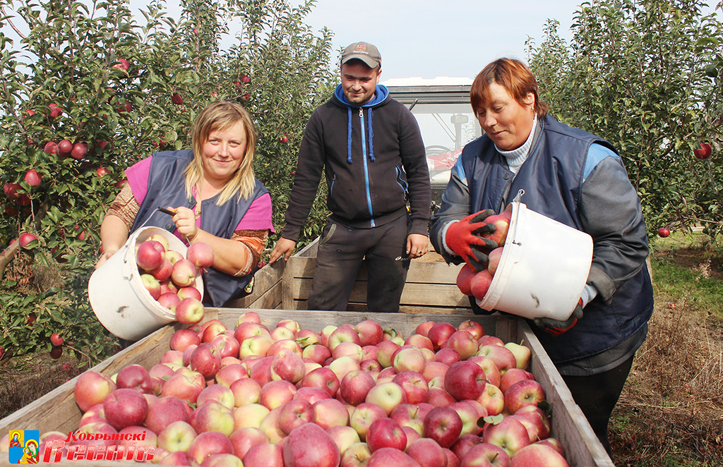 На зборы працуе чатыры брыгады — каля 30 чалавек, якія штодня здымаюць з дрэў 23-25 тон яблыкаў. Жанчыны і мужчыны зрываюць яблыкі ў пластмасавыя вёдры і акуратна, каб не пабіць, высыпаюць у бурты трактара, які праязджае паміж радамі паўкарлікавых яблыняў.