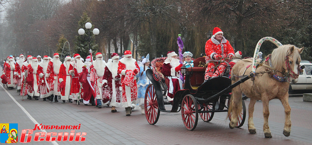 Несмотря на уже традиционное отсутствие снега, который в этом году опоздал всего на один день, настроение кобринчан было поистине новогодним. Этому способствовала яркая праздничная программа с участием артистов Кобринщины и, конечно же, Дедов-Морозов и Снегурочек, которые парадом прошлись по улице Суворова и центральной площади города. Масса развлечений была предусмотрена для самых маленьких – вокруг ёлки можно было прокатиться в карете и на паровозике, а рядом сказочные персонажи развлекали гостей весёлыми конкурсами и задорными играми, работали объекты розничной торговли.