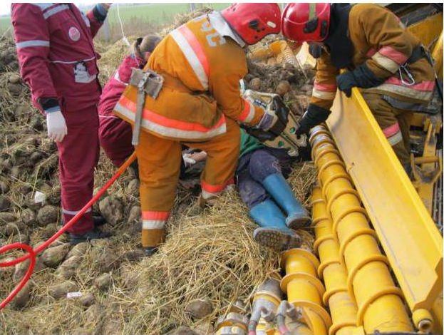 К месту вызова были направлены отделение на автомобиле быстрого реагирования пожарной аварийно-спасательной части № 1 Пинска и бригада скорой медицинской помощи. Как выяснилось, в шнеке установленного на площадке овощехранилище свеклоуборочного комбайна "Кляйн PL 200 SF" 2002 года выпуска заблокирована рука разнорабочей СПК "Ставокский" 1950 г. рождения. Происшествие случилось при проведении работ по очистке корнеплодов перед загрузкой в хранилище. В течение нескольких минут рботниками МЧС при помощи гидравлических ножниц и бензореза пострадавшая была деблокирована и передана бригаде врачей. С переломом и рваной раной руки женщина госпитализирована в реанимационное отделение Пинской центральной городской больницы.