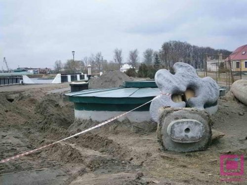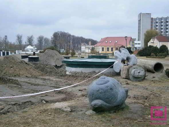 Такім дзіўным чынам будаўнікі вывелі каналізацыйныя рыштаванні ад студэнцкай вёскі Палескага дзяржуніверсітэту. На заўвагі кіраўніцтва і жыхароў горада праектная арганізацыя прапануе схаваць непрыгожыя элементы землянымі курганамі з дэкаратыўнымі кусцікамі.