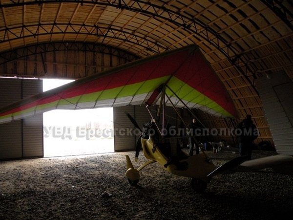 В ангаре во дворе его дачного дома в Пинском районе правоохранители обнаружили незарегистрированные мотодельтоплан и самолет "Элин - 42М" (1977 года выпуска).