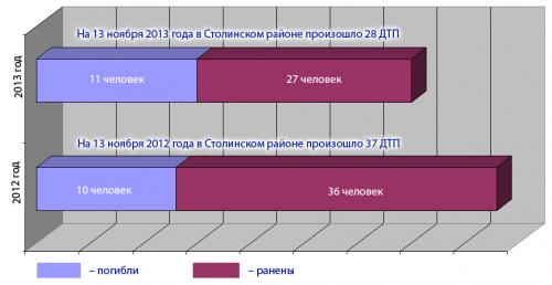 На 13 ноября этого года в районе произошло 28 ДТП, в которых 11 человек погибли и 27 получили ранения различной степени тяжести. На такой же период 2012 г. пришлось 37 ДТП, в которых 10 человек погибли и 36 были ранены.