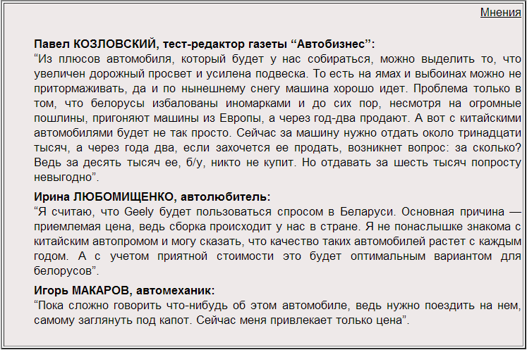 — Какова особенность белорусской сборки, чем отличается наша Geely, например, от тех машин, которые выпускались в Украине, производятся в России? — спросила я.