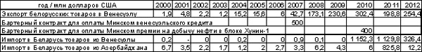 Суммарный белорусский экспорт в Венесуэлу составил в 2008-2012 годах 1,16 млрд. долларов. Другими словами, экспорт вне упомянутых контрактов — 160 млн. долларов — стоимость груза двух нефтяных танкеров. Для сравнения, импорт венесуэльской нефти в 2010-2012 годах и частично заменившей ее в 2011 году азербайджанской составил около 3,5 млрд. долларов. Это втрое больше суммарного белорусского экспорта в Венесуэлу за все время независимости!