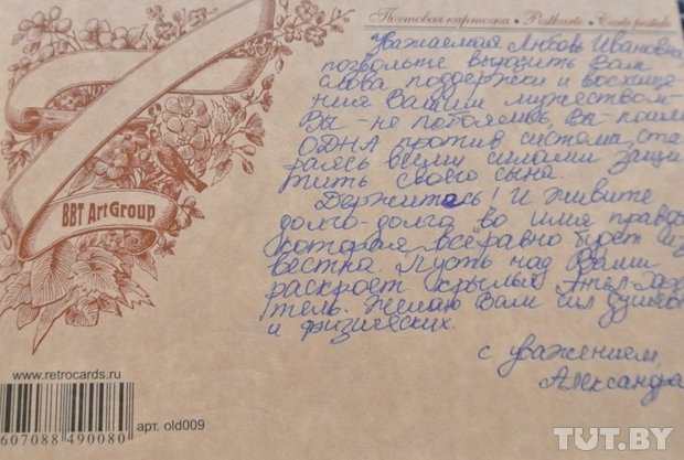 Любовь Ковалева показывает десятки писем, которые за это время пришли ей от людей. Судя по письмам, службы по "первым белорусским террористам" отслужили не в одной церкви.