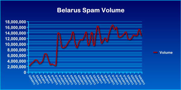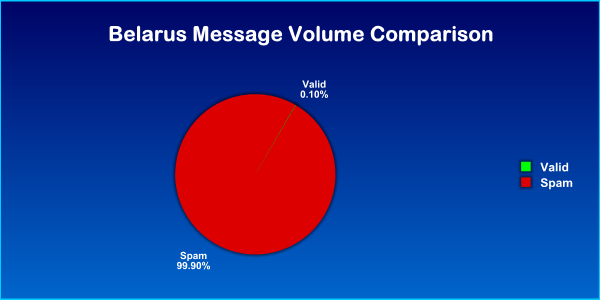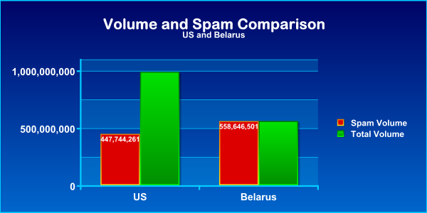 На Беларусь, согласно исследованию, в настоящее время приходится 16,3 процента мирового спама, по сравнению с 15,1 процента из США и 7,45 процента из Украины. На Китай приходится 5,78 процента мирового спама.