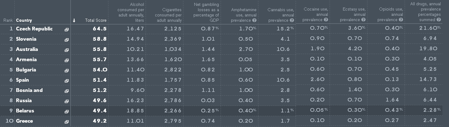 Для составления рейтинга были взяты 4 переменные: среднее количества алкоголя, которое выпивает каждый взрослый житель страны, количество потребляемых сигарет, распространенность наркотиков (процент принимающих наркотические средства среди жителей в возрасте от 15 до 64 лет) и общие потери от азартных игр в процентах от ВВП.