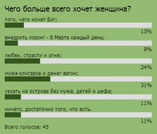 Хотите узнать больше? В опросе на «Медиа-Полесье», проходившем в преддверии 8 Марта, респондентам предлагалось ответить на вопрос «Чего больше всего хочет женщина?» ...