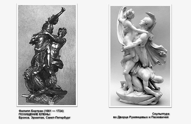 Приведем еще аргументы. Скульптура из дворца Румянцевых и Паскевичей обнаруживает значительное сходство с работой Филиппа Бертрана «Похищение Елены», которая находится в Государственном Эрмитаже в Санкт-Петербурге. Не отрывая глаз от прекрасного лица девы, уверенный в победе, молодой воин переносит свою добычу на корабль, чтобы быстрее уйти от оскорбленного мужа, от чужого берега. Фигуры полны динамики, стремительного действия. Пластика движения подчеркивается энергичными спиральными завитками одежд. Все изображение дано в соответствии со стилистикой барокко. При том, что прототипом являлся оригинал 430 — 420-х гг. до н. э. греческого скульптора Кресилая, Филипп Бертран создал произведение в духе своего времени. Можно только предположить, как выглядело «Похищение Елены» в эпоху эллинизма!