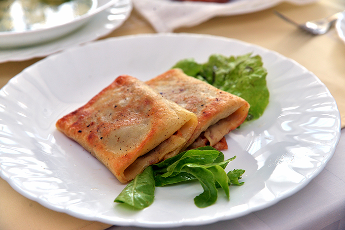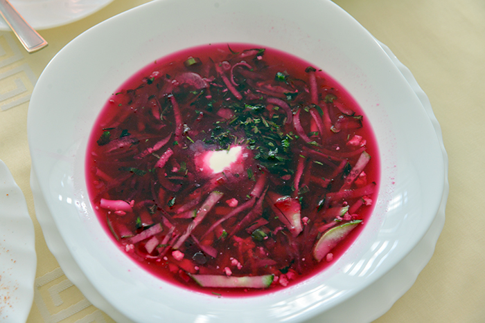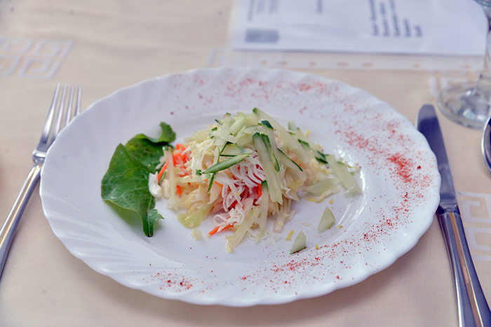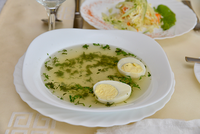В ресторане предлагают на выбор два «комплекса». В первом сегодня на обед салат «Белоснежка» (за 100 граммов 3900 рублей), бульон с яйцом (4600), два блинчика с мясом (17100), компот (3600) и хлеб (700). Второй вариант включает салат «Витаминный» (4000), борщ холодный (6400), котлету из свинины (9900), кашу гречневую с соусом (5300), компот и хлеб по тем же ценам.