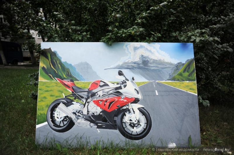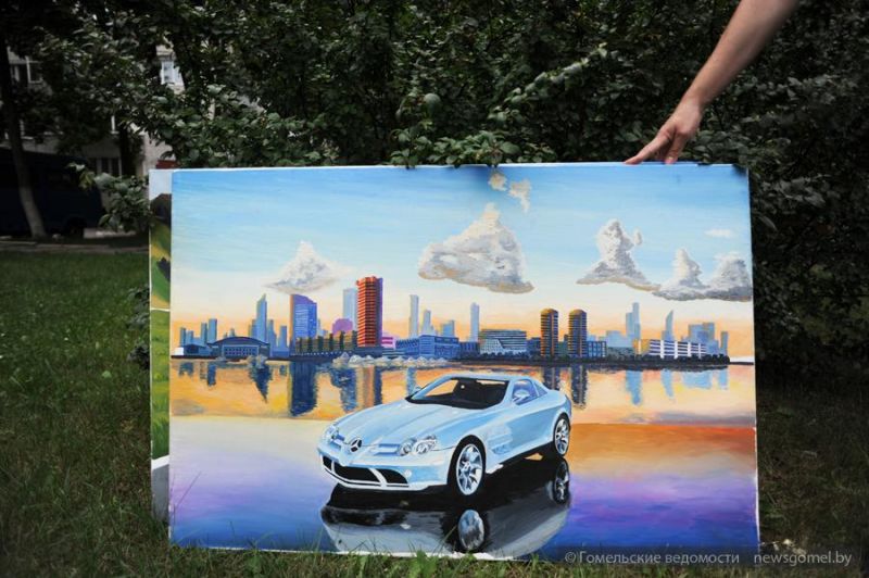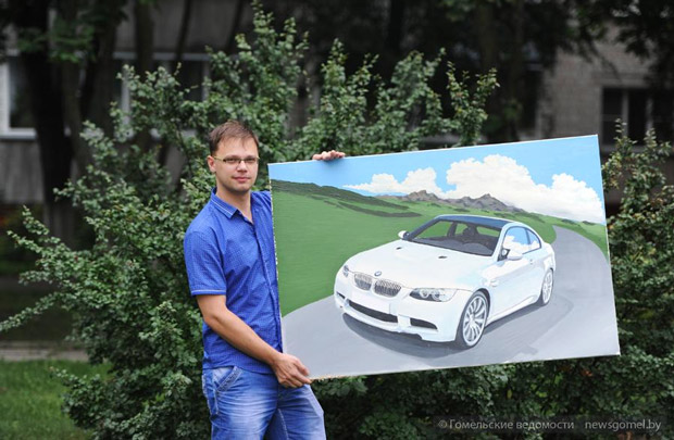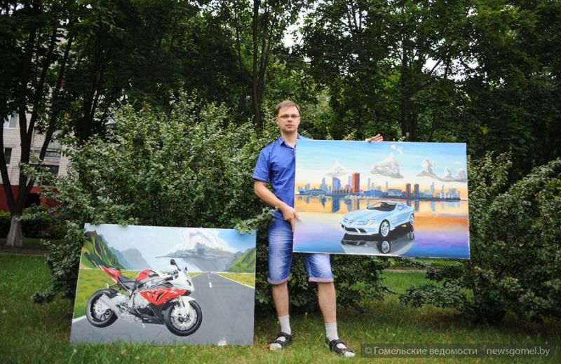 На холсте размером 120 на 80 см. молодой человек пишет вовсе не портреты. Из-под его лёгкой руки выходят изображения современных моделей авто- и мототехники.
