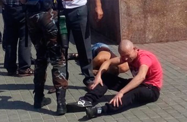 В центре Гомеля двое пьяных хулиганов пытались избить водителя автобуса, однако были задержаны прохожими (фото)