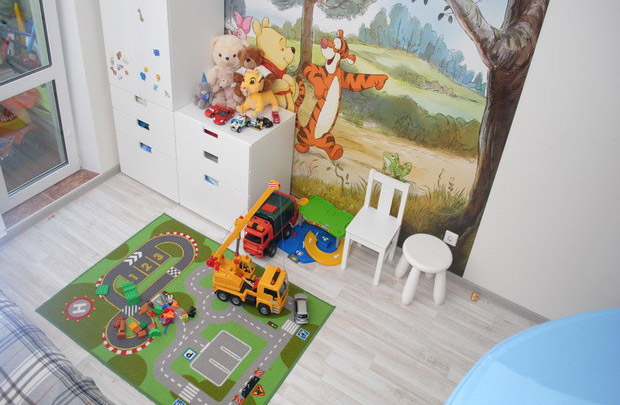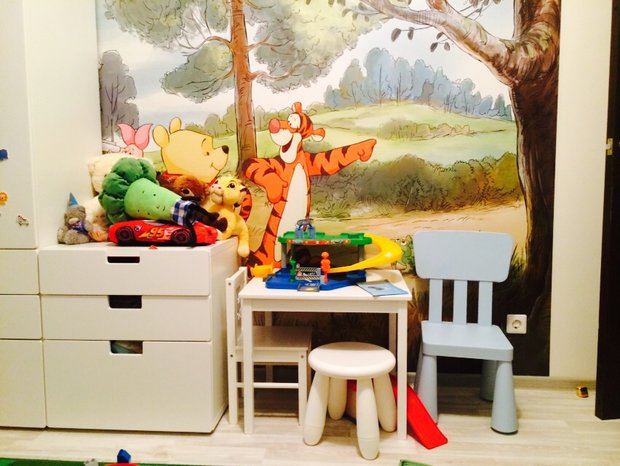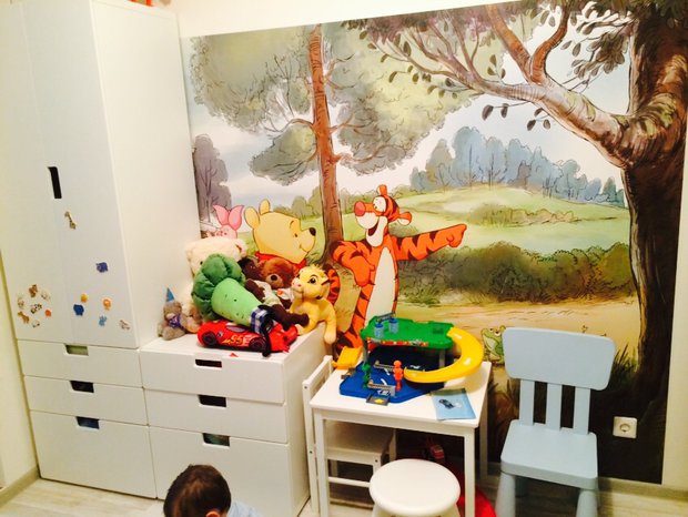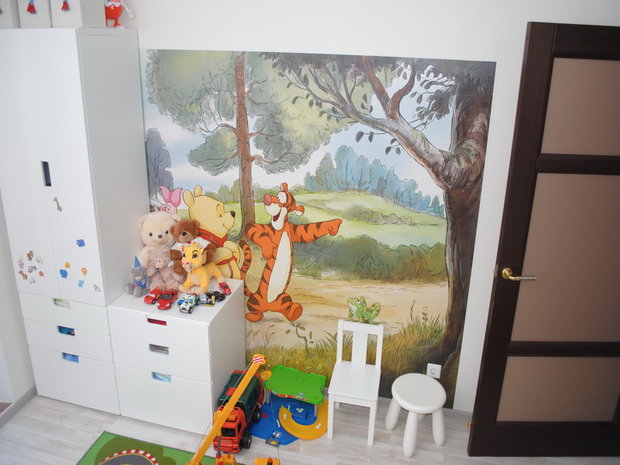 На стенах — однотонные обои бело-сливочного оттенка, производство — Германия. Покупали в строительном магазине со скидкой. Обои — неяркие, так как на одной из стен — фотообои (Komar, Германия). Во время ремонта Платону был один год, поэтому картинка фотообоев — «Винни Пух». Она приятных, мягких цветов.