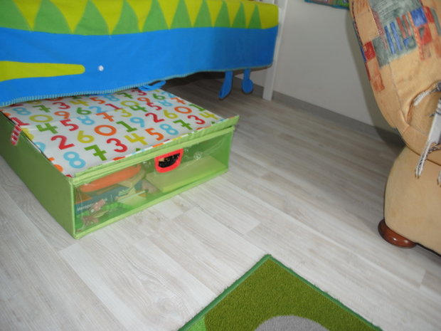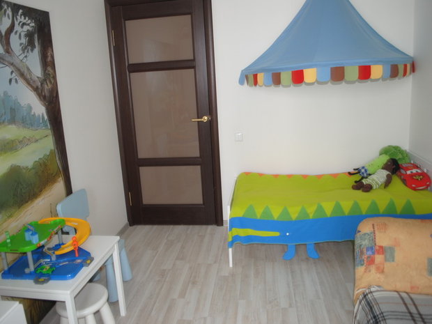 На полу лежал ковролин, но ребенок начал очень сильно болеть, поэтому уложили ламинат. С тех пор частота ОРВИ снизилась в три раза. Ламинат покупали самый недорогой, российского производства, но 32 класса и с «антистатическим эффектом». Он приятного теплого оттенка, имеет хорошую структуру под ясень, не скользит, по нему очень классно ходить босиком.