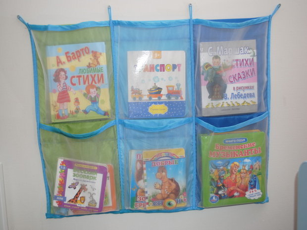 Рядом с кроваткой повесили кармашки для книжек. Ребенок самостоятельно выбирает, что ему почитать. Опять же, легко соблюдать порядок.