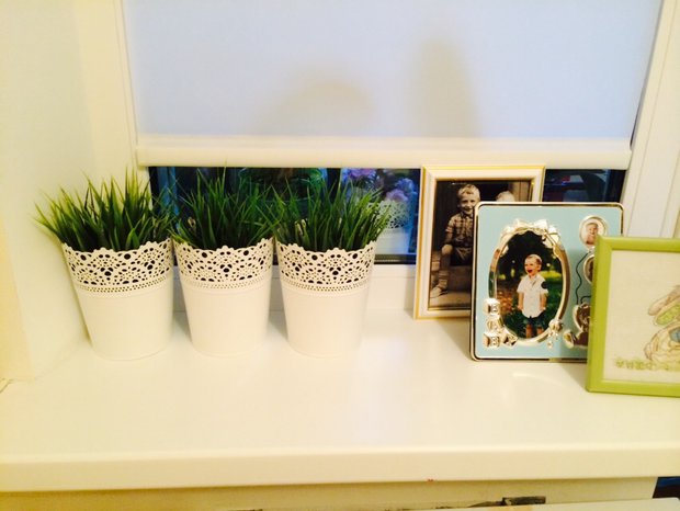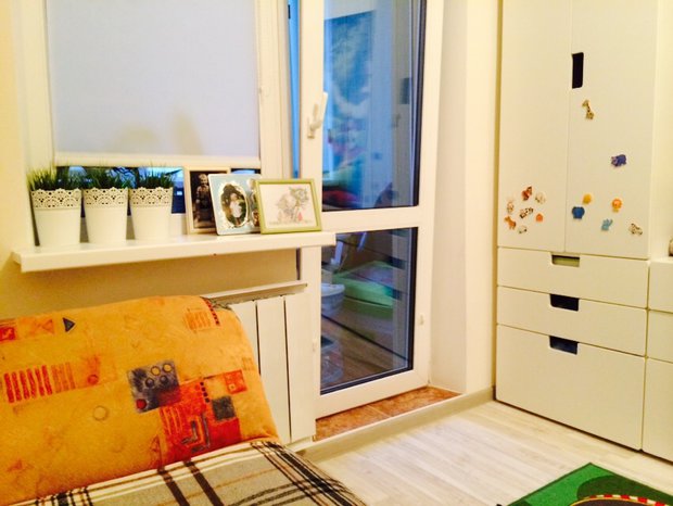 Квартира угловая, расположена на первом этаже, детская — с балконом. Поэтому от штор отказались (без них намного светлее), а на подоконник поставили горшочки с искусственной травой и рамочки с фото.