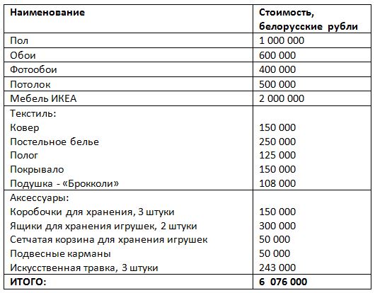 Наша детская очень бюджетная и придется по карману каждому белорусу. Ремонт делали очень быстро и из недорогих материалов. Квартира — временная, поэтому основной целью было сделать недорогой, но красивый ремонт.
